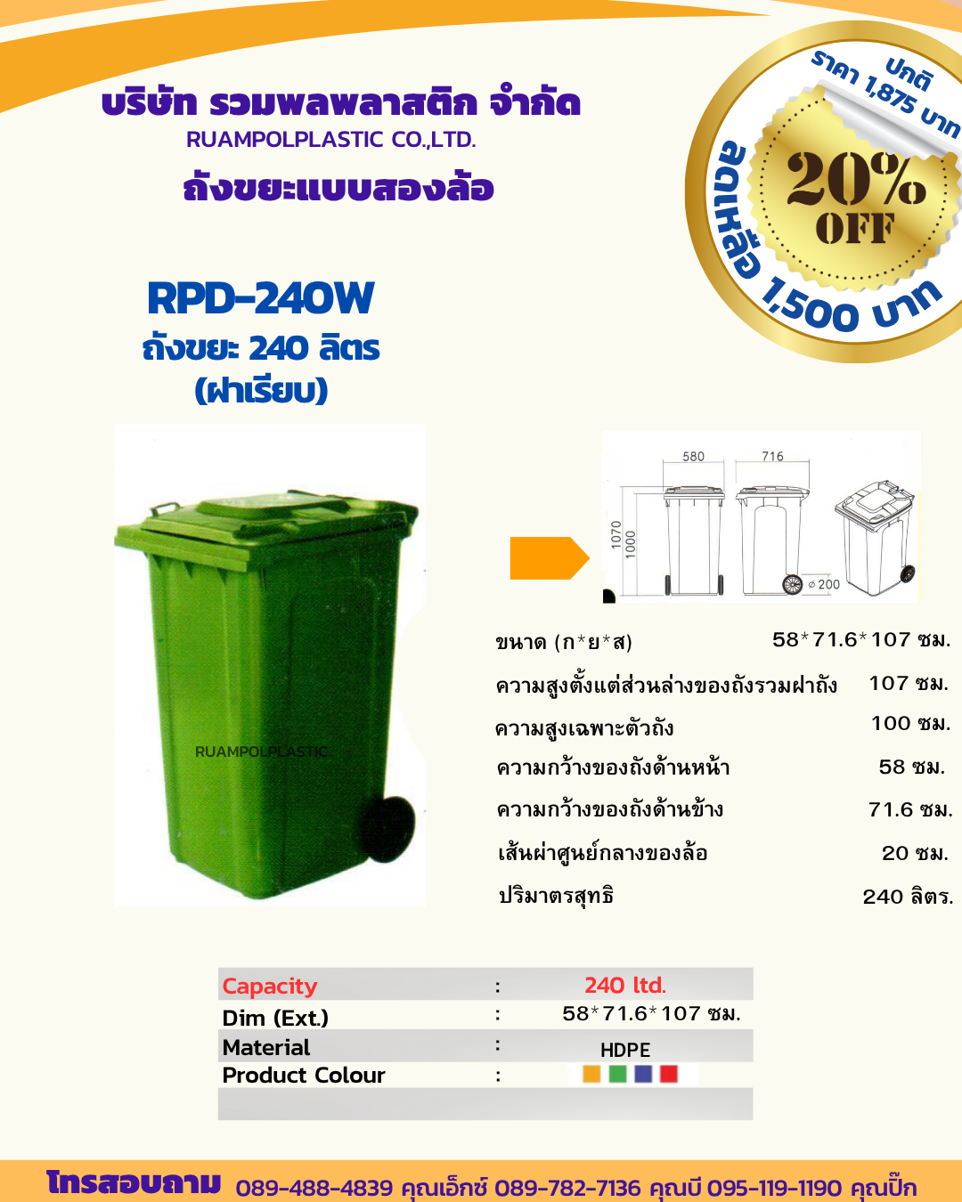 ถังขยะแบบสองล้อ RPD-240W ถังขยะ 240 ลิตร (ฝาเรียบ)
