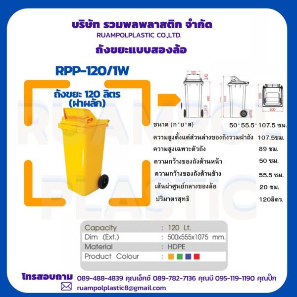 ถังขยะแบบสองล้อ RPP-120/1W ถังขยะ 120 ลิตร (ฝาผลัก)