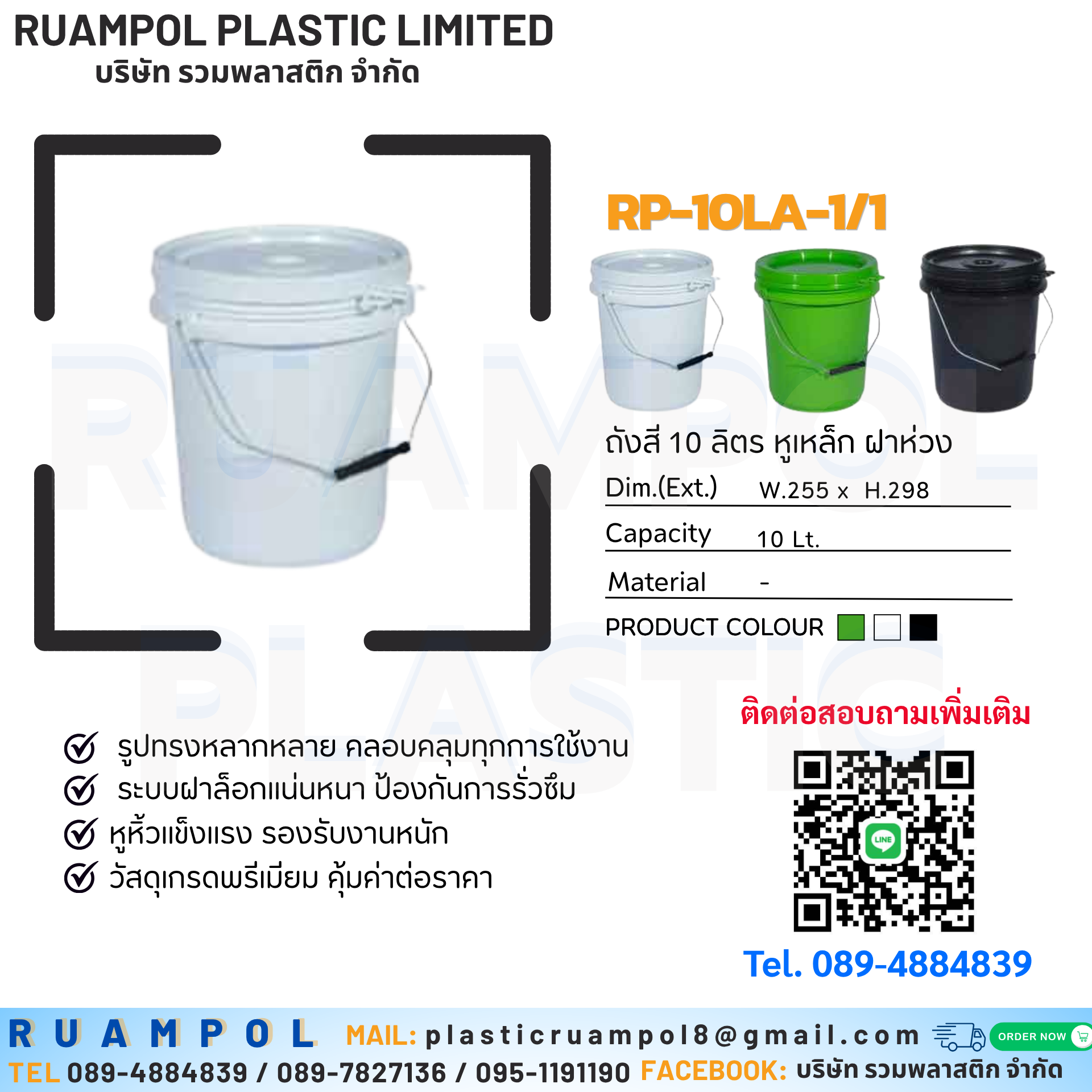 ถังสี 10 ลิตร หูเหล็ก ฝาห่วง รหัสสินค้า : RP-10LA-1/1