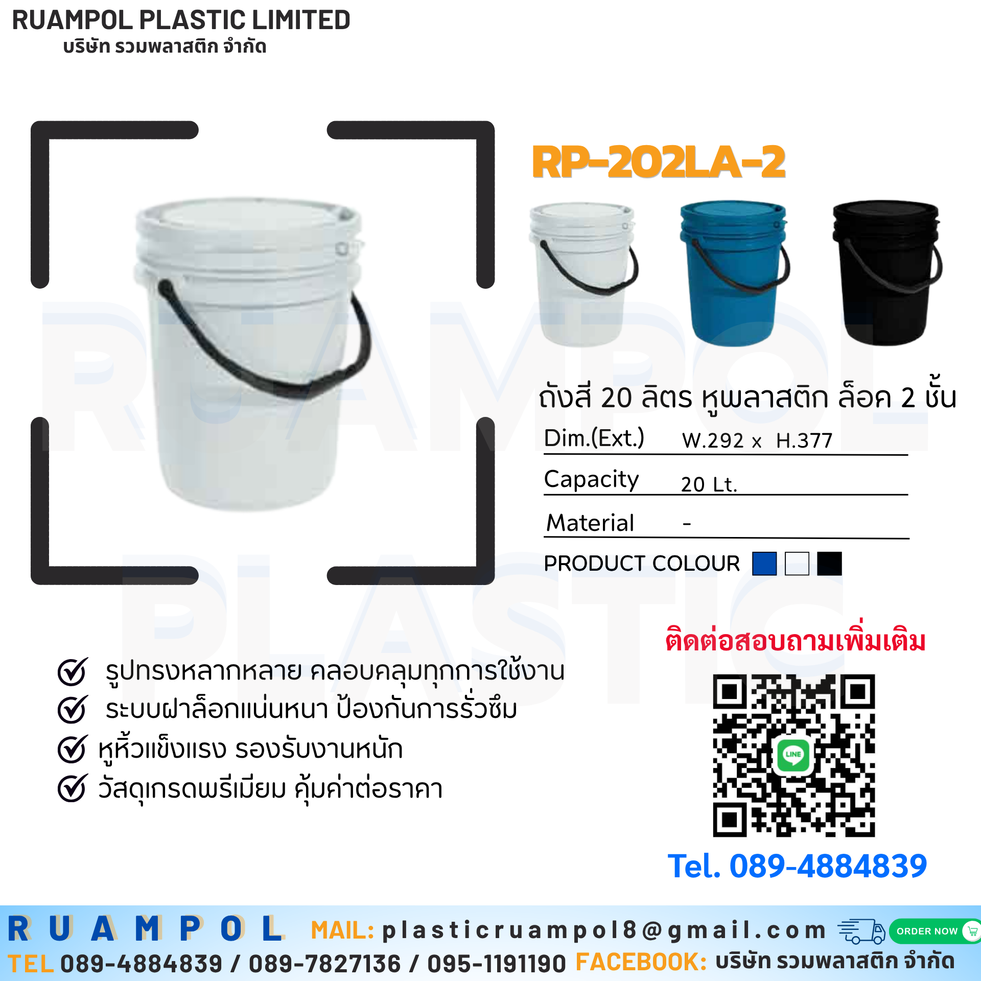 ถังสี 20 ลิตร หูพลาสติก ล็อค 2 ชั้น รหัสสินค้า : RP-202LA-2