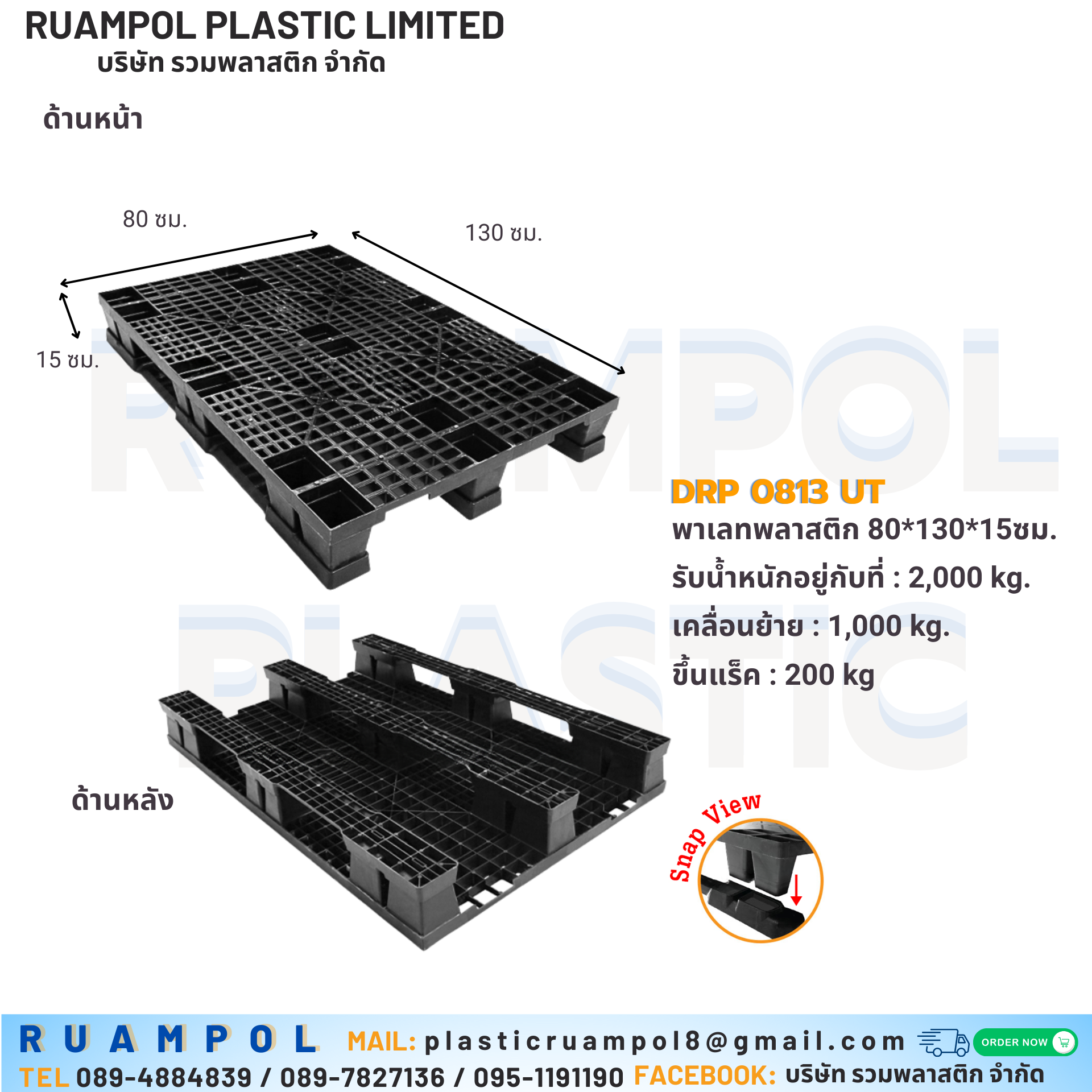 ขนาด : พาเลทพลาสติก 80*130*15 cm. หลุม (หน้าตะแกรง) มือ1