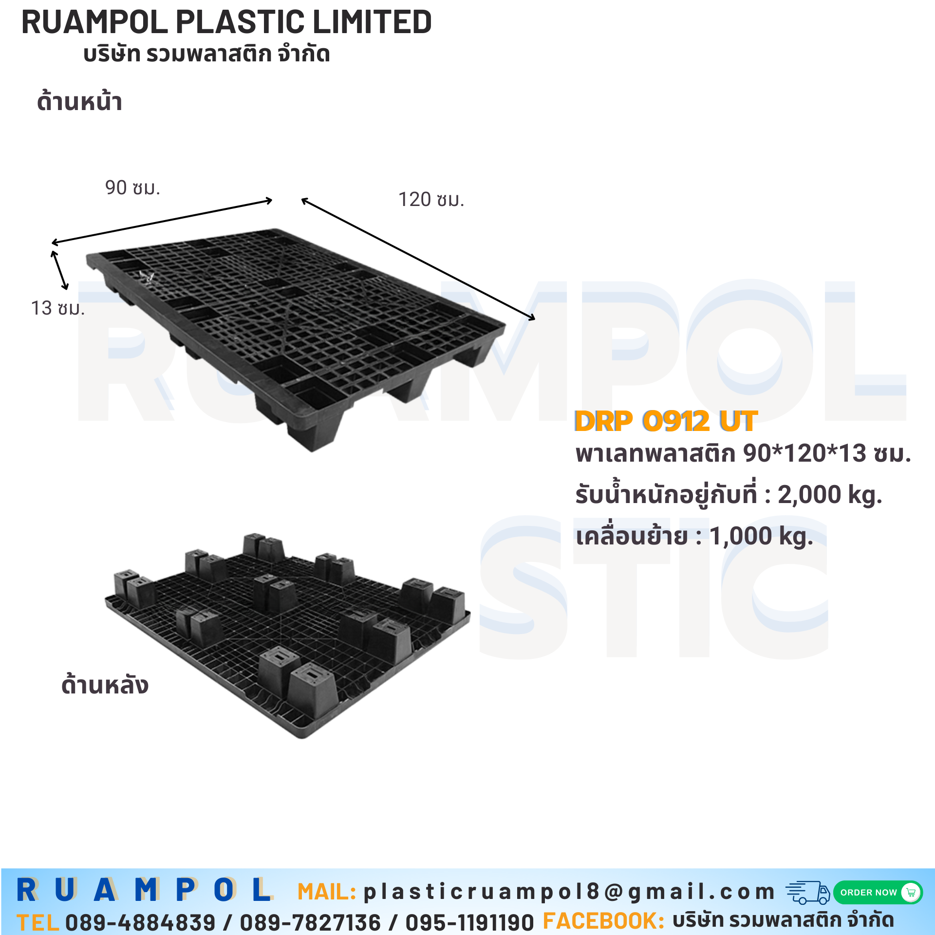 ขนาด : พาเลทพลาสติก 90*120*13 cm. หลุม (หน้าตะแกรง) มือ1