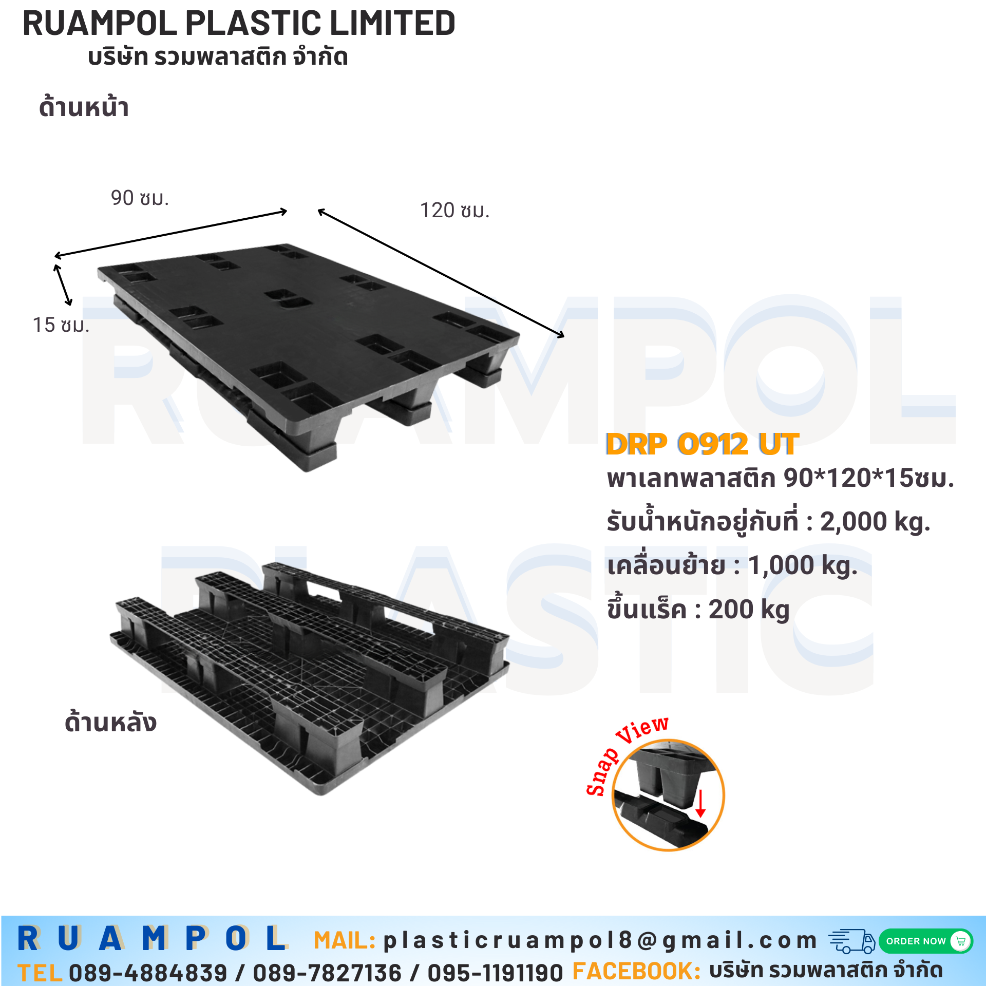 ขนาด : พาเลทพลาสติก 90*120*15 cm. หลุม (หน้าเรียบ) มือ1